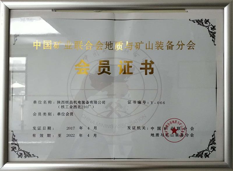中國礦業(yè)聯(lián)合會地質(zhì)與礦山裝備分會會員證書