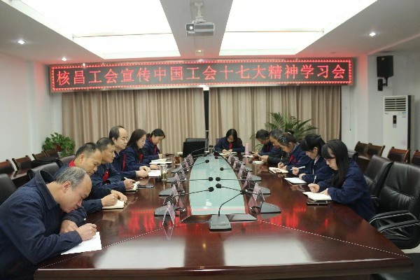 2018年11月15日下午,陜西核昌機電裝備有限公司工會在小會議室召開傳達關于貫徹中國工會十七大精神學習的會議。核昌公司工會主席梁英平、副主席李榮、公司工會委員、干事、各分工會主...
