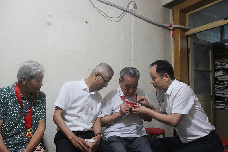 在小區(qū)離退辦,王建國(guó)詳細(xì)詢問(wèn)了老人們的身體狀況、生活情況,囑咐老人要注意保重身體,并叮囑隨行人員一定要結(jié)合黨史學(xué)習(xí)教育,帶著感情、帶著責(zé)任幫助他們解決實(shí)際困難,落實(shí)好各項(xiàng)政策,照顧好日常生活,讓他們切實(shí)感受到組織的溫暖、幸福愉快地安享晚年。他為在黨50年的老黨員們親手佩戴了黨中央頒發(fā)的“光榮在黨50年”紀(jì)念章,并與部分老黨員進(jìn)行了座談。佩戴上黨章的老黨員們熱淚盈眶,激動(dòng)地唱起《沒(méi)有共產(chǎn)黨就沒(méi)有新中國(guó)》等革命歌曲,慷慨激昂的旋律,高亢熱情的聲音,彰顯了老一輩共產(chǎn)黨員初心不改的熱忱。大家紛紛表示深切感受到了以習(xí)近平同志為核心的黨中央的關(guān)懷和溫暖,要始終牢記黨的宗旨,聽黨話、感黨恩、跟黨走,力所能及地發(fā)揮老黨員的余熱,用實(shí)際行動(dòng)為公司高質(zhì)量發(fā)展鼓勁加油。